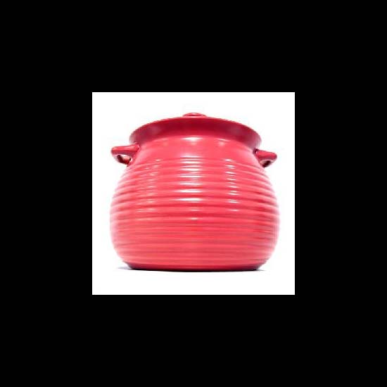 This is a red cooking pot with 2 handles at the both sides.