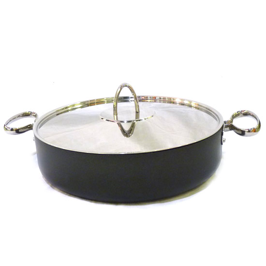As shown is a cooking pan coming with a round base and a deep body. The surface comes with a non-stick coating for easy cleaning. The cover is made of stainless steel for enhanced durability.