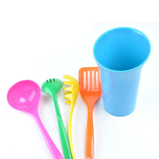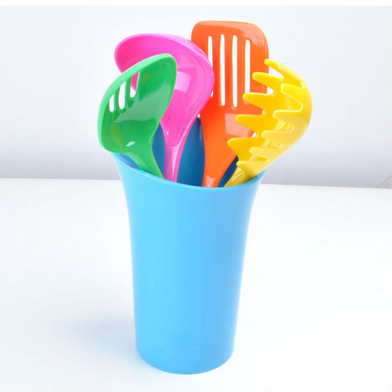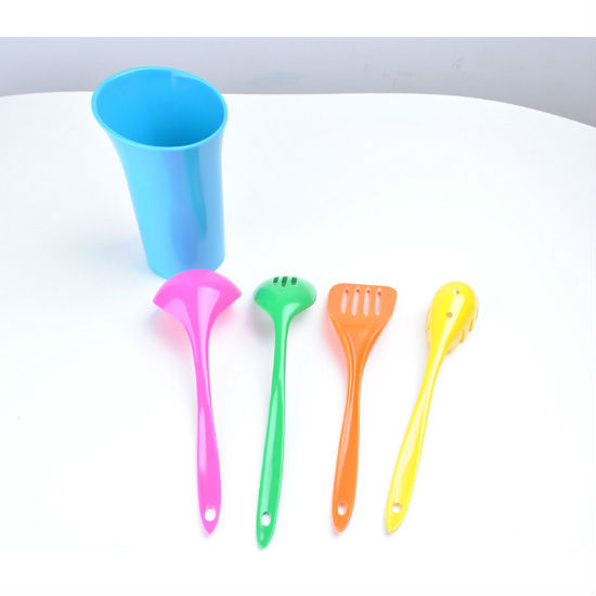 Set of 5pcs kitchen utensils with cup holder including one cup holder, laddle, turner, slotted spoon and spaguetti spoon with bright colors.