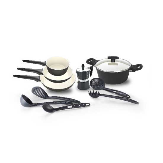 This cookware set features elegant and sophisticated black and metal color combination for the most demanding clientele. The cookware features a stainless steel handle or a non-slip handle enriched by a chrome-plated insert. This cold-forged and ceramic-coated cookware ensures high performance. They are elegant tools to serve food in the most sophisticated dining rooms.