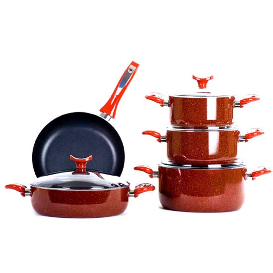 The cookware set includes saucepans, frying pans, cooking pots, etc. Each piece of cookware is painted in red with a highly polished surface, offering beautiful shine that adds a lustrous look to your cookware collection. The exquisite design ensures even heat distribution for efficient cooking. This cookware set is a complete addition for every kitchen.