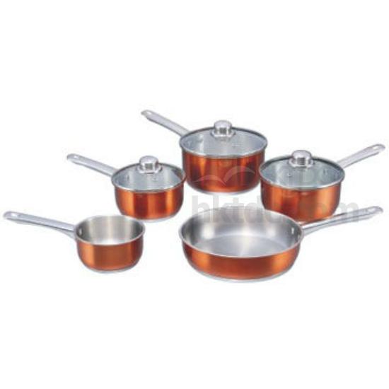 Cookware set in 8 pieces, saucepan and frypan, color painted body and glass lid with airvent, brushed interior, thick aluminum core in the capsuled bottom, induction base