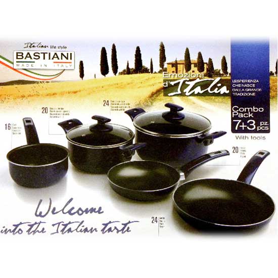 This exclusive cookware set includes three frying pans and two stock pots. The top-notch cookware is finely made of aluminum and stainless steel in Italy. The cookware is durable and easy to clean.