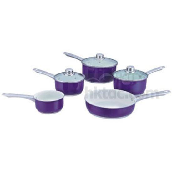 Cookware set in 8 pieces, saucepan and fry pan, color painted body and glass lid with air vent, ceramic Coating interior, thick aluminum core in the capsuled bottom, induction base