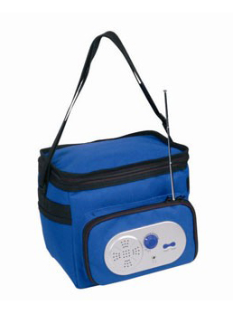 Highlighted here is a cooler bag for keeping your food and beverages cool. It is made of PVC and has a spacious rectangular main compartment with zipper closure. This cooler bag has an adjustable strap for convenient carrying and has a radio with an antenna in the external pocket for entertainment use.