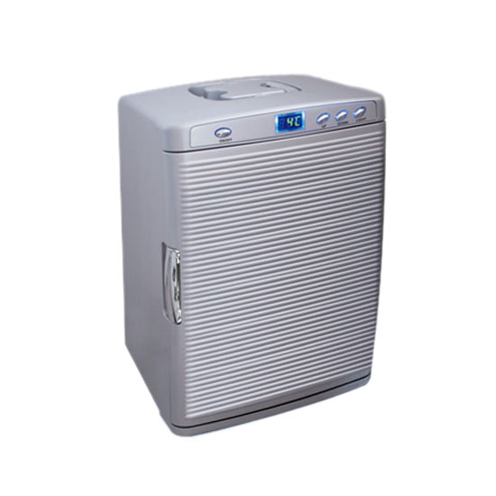 This stylish cooler and warmer in white comes with protruding stripes on the door. It is equipped with a temperature display and buttons on the top for easy operation. This 25L cooler and warmer is a reliable and practical choice.