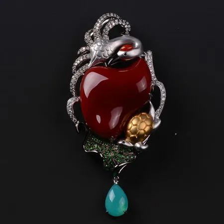 Crane and tortoise symbol to live a long life, usually used to congratulate elders. It takes coral to grow only 1 inch for 20 years. The whole design symbolize longevity, good fortune, and auspicious. Aka coral as central stone, diamond paved crane, and white18K gold, yellow 18k gold for tortoise, tsavorite stone made lily pad, a drop ending in blue chalcedony. This masterpiece is definitely a good present for the elders.