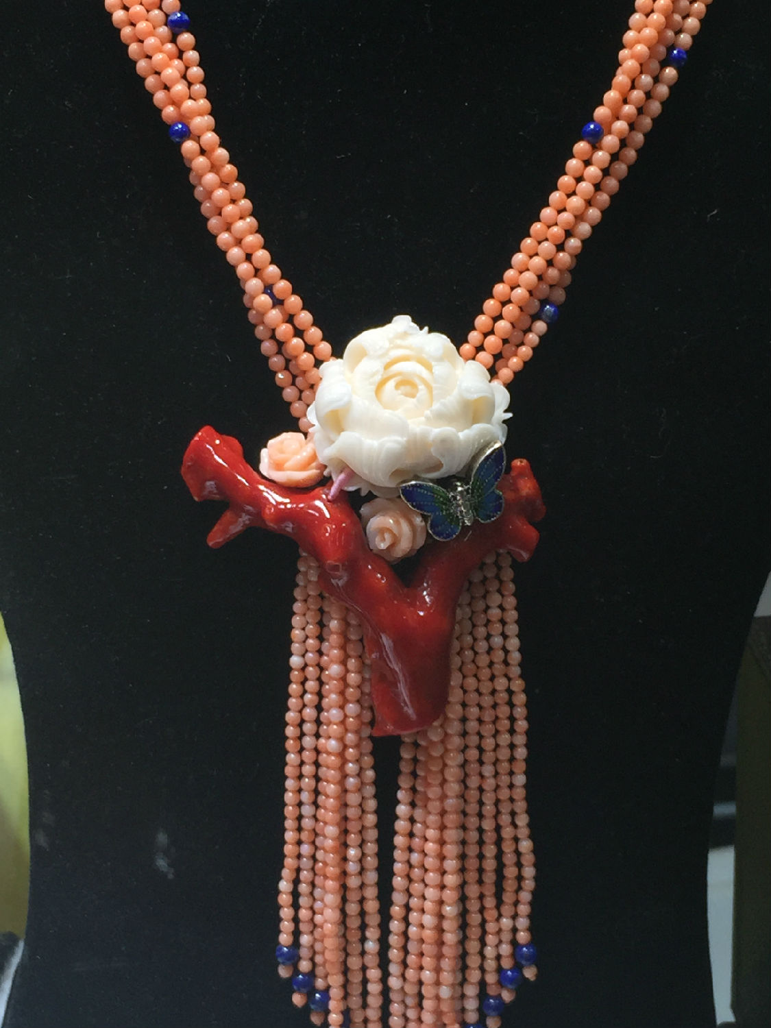 A necklace called Lucky Auspicious Peony with all the natural Angel Skin coral chains, by putting 3 different kinds of Corals(AKA, MOMO & White Coral) to display the colorful flower tree of Spring.
