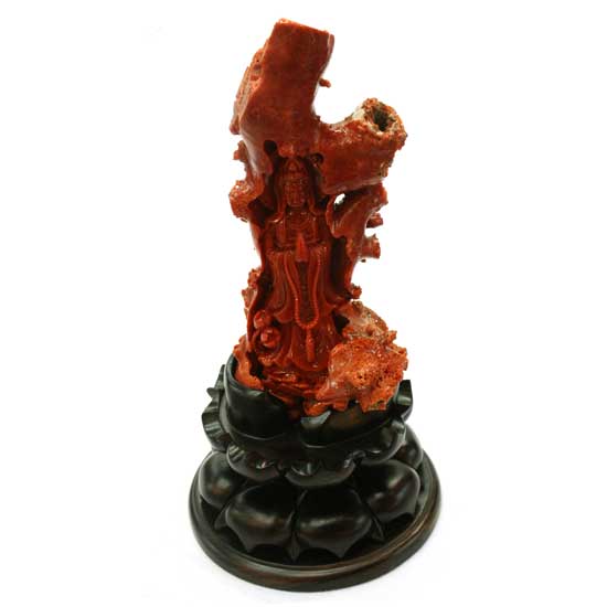 Featured here is a decorative statue finely crafted in blood coral. The natural saffron tone enhances the oriental beauty of the design. This statue is entirely crafted by hands to promise refined workmanship.
