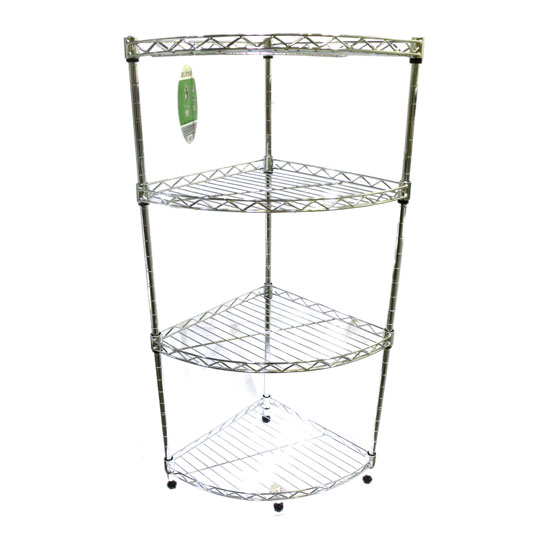 Featured is a multi-purpose wire shelf designed for use in corners. The four-tier structure maximizes the storage space for use. It offers a reliable and neat storage solution in the kitchen and bathroom.