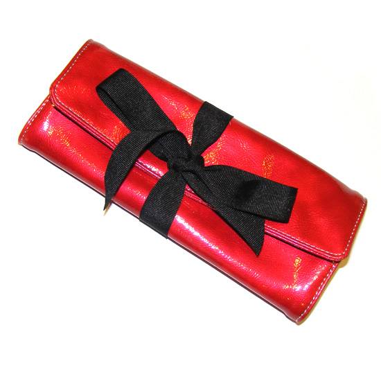 This is a cosmetic bag made of leather. The cosmetic bag features a sharp red color tied with a strap in black. There are other colors available.