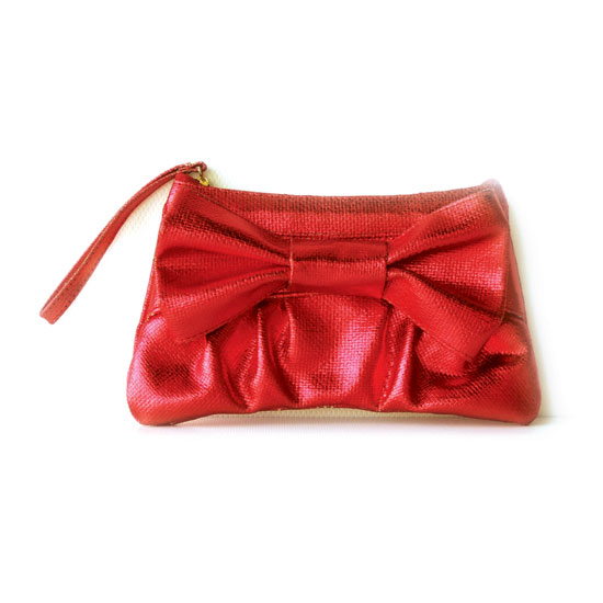 Pictured is an alluring cosmetic bag in striking red. The main zipper unzips to reveal a compact interior for your must-have makeup supplies. The eye-catching knot ornament completes the bag with added elegance and style.