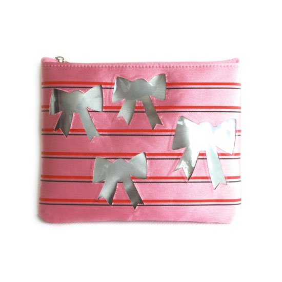 The cosmetic bag holds and organizes your cosmetics and other essentials in a stylish way. The striped patterns are accented beautifully with cut-out ribbon-bow patterns. This adorable cosmetic bag will give your toiletries a home.