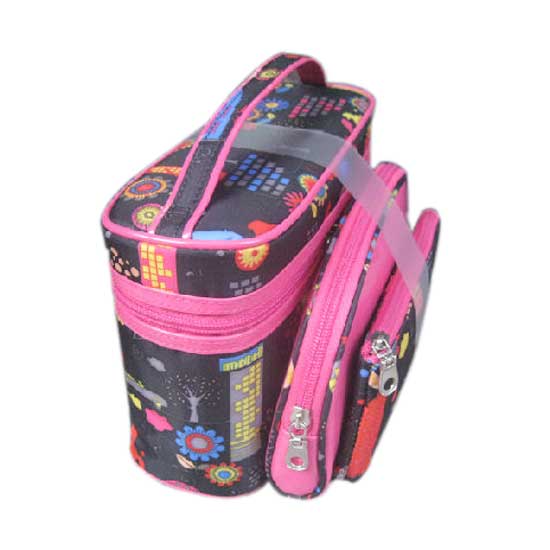 This is a high quality cosmetic bag coming with three separated zipper compartments. It features brilliant patterns in pink, red, blue, yellow and black for attractiveness. This stylish cosmetic bag makes a delightful gift for ladies.