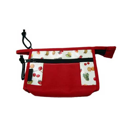 This is a cosmetic bag with a front zipper pocket. In an eye-catching red color, this makeup bag is decorated with a fun fruit motif. This cosmetic bag has a large capacity for efficient usage.