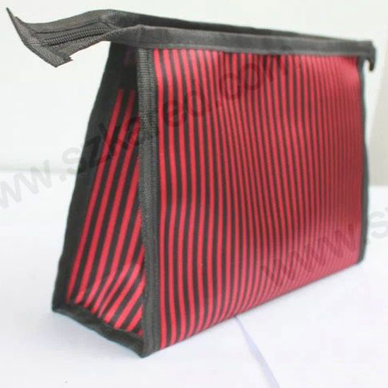 This cosmetic bag is remarkable for its stylish red and black stripes. The appropriate capacity provides sufficient space for an assortment of make-up products and tools. It is lightweight, portable and easy to use.
