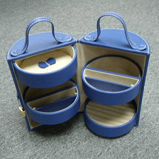 Featured here is a cylindrical cosmetic case. It comes with a handle on top for easy carriage. It is composed of 4 storeys for storage of various cosmetic items.