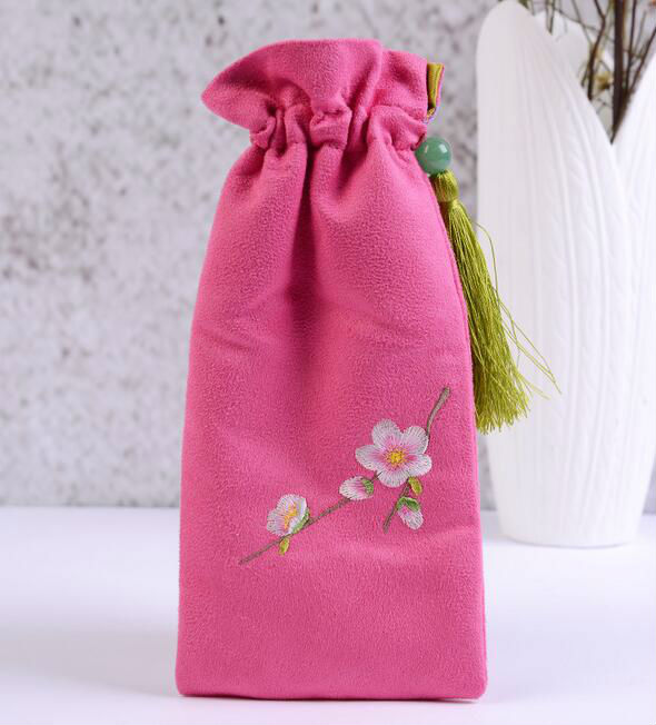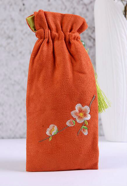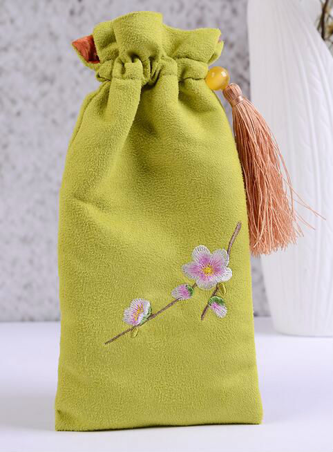 Displayed here is a velvet glasses pocket made of cotton with embroidery logo. It comes in a compact rectangular shape and is adorned with floral patterns on the exterior. The bag has drawstring closure and has a tassel on the drawstring for decoration.