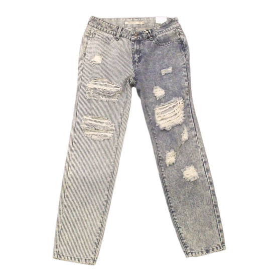 This pair of long jeans is cool and chic with its original design. The right leg is specially adorned with a subtle stripe pattern for a touch of uniqueness. The slightly distressed parts further enhance the stylish look.