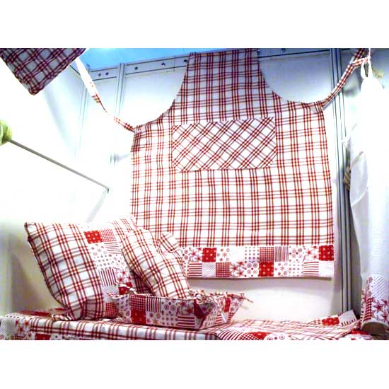 The kitchen set includes an apron, an oven glove, a table cloth, etc. The checkered patterns in red and white colors give a touch of uniqueness. This kitchen set offers excellent kitchen utensils for household use.