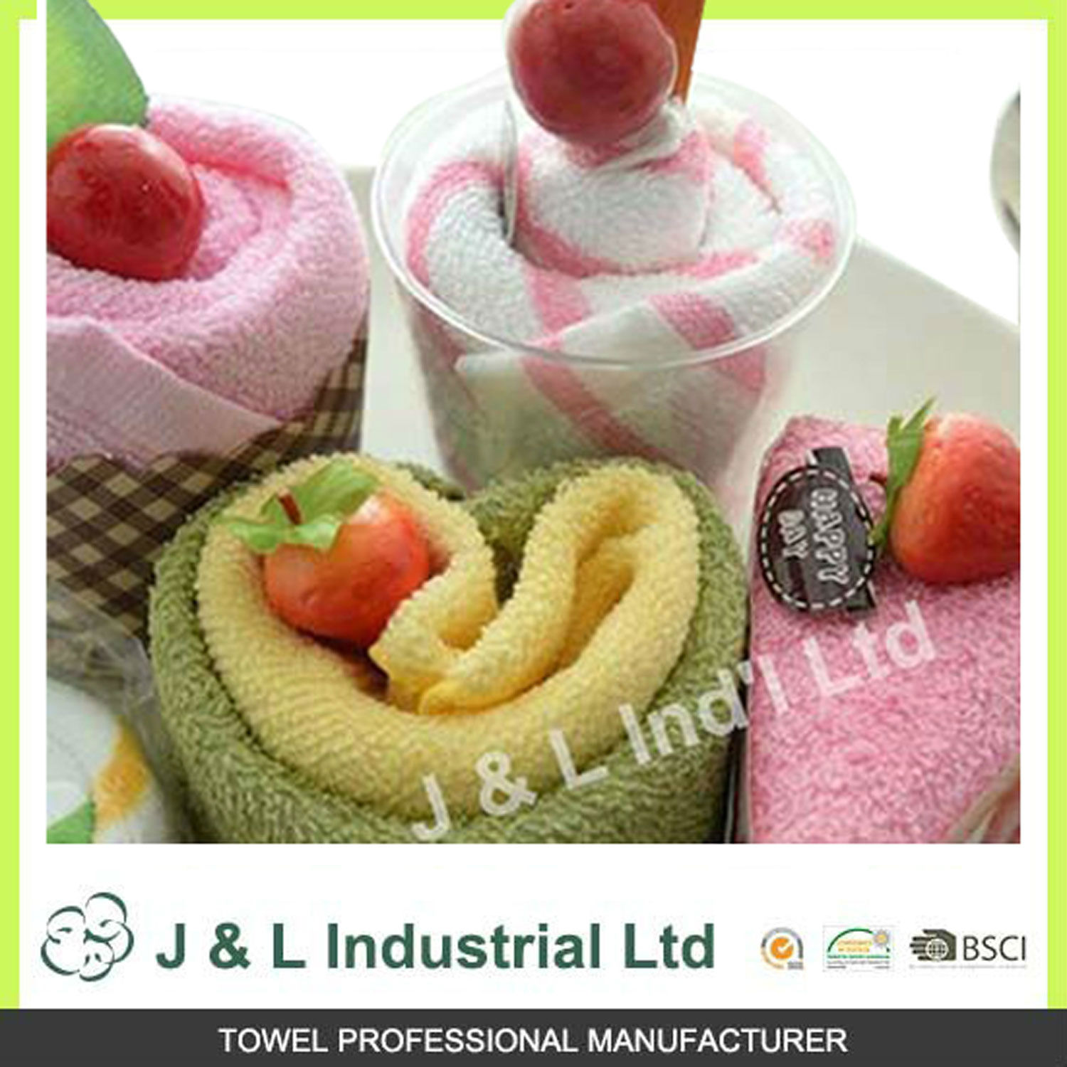 Featured here is a cotton towel in a cake design. This colorful towel is arranged to look like a cake and is decorated with an imitation fruit on top. It is available in different cake designs and is a great item for promotional use.