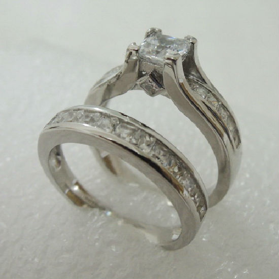 Designed with an elegant style, this lovable couple ring set consists of two matching ring bands. One of the rings features a shimmering square cut embellishment at the center. Both ring shanks glisten with a row of accent adornments to add a fashionable appeal.