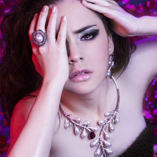The matching ring features a 14mm Australian white south sea pearls in a flower motif, dotted with brilliant diamonds, sapphires and rubies.