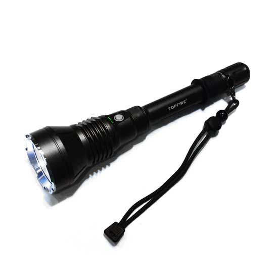 The displayed flashlight in black with a slim handle is fitted with the Cree-XML-T6 light source, boasting a long life of 50,000 hours. It has reached the IPX8 rating to ensure water resistance. This high performance flashlight is ideal for emergency use.