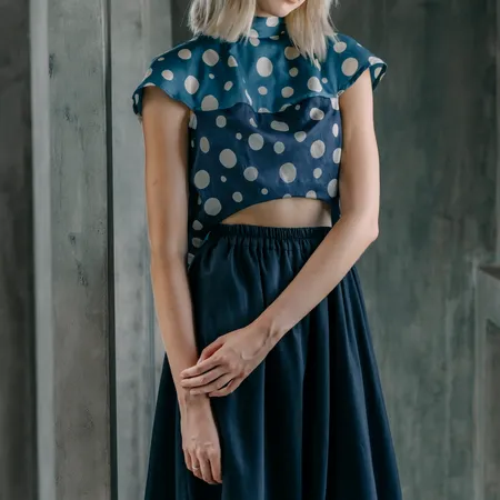 Front-to-back reversible cropped bubble blouse in blue cotton sateen print.100% cotton sateen print
