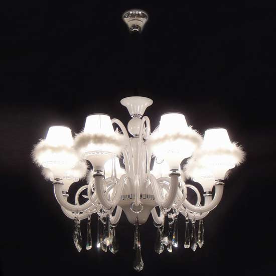 This beautiful chandelier features an upscale design. Eight conical lampshades are supported by coiled arms, which hold dangling crystal pieces in midair. Each shade is also wrapped up with a furry braid. This dainty chandelier adds eye-catching light to a dining room.