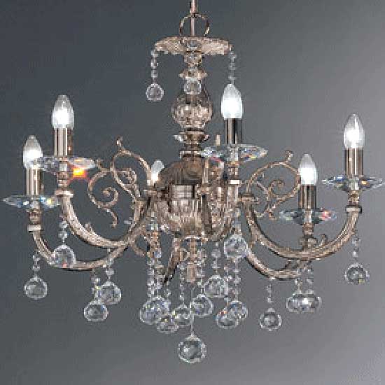 This dainty chandelier features an upscale design with scrolling arms. Six bulbs are standing proudly atop resembling candle figures. This luxurious chandelier highlights a gleaming metallic finish with strands of crystal bobeches, providing plenty of sparkle.