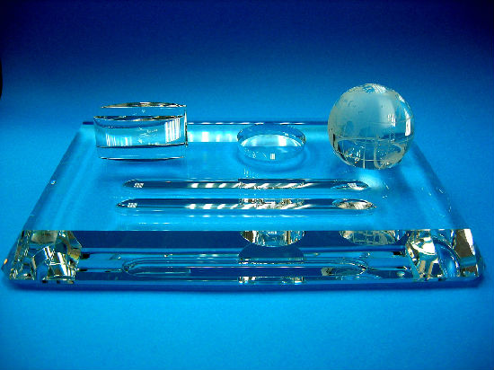 Optical glass desk accessory with spinning globe 60mm diameter, card holder, hole for ink bottle and groove for holding two pen.