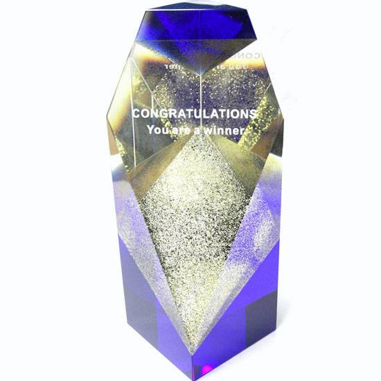 The Eco-crystalTrophy is nicely packaged for perfect presentation. The color-coated trophy boasts a faceted design inlaid with glitter to create maximum sparkling effects. Award prestigious people's effort with this inspired crystal trophy.