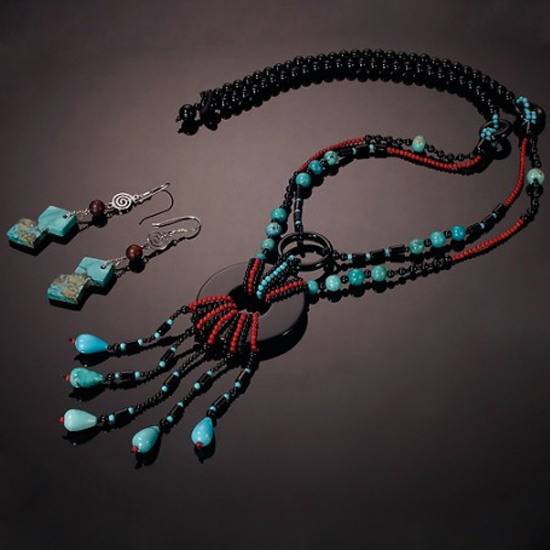 This gorgeous jewelry set includes a multi-strand necklace and a pair of dangling turquoise earrings. Turquoise, black agate and coral beads make up the visually pleasing necklace. Featuring a circular pendant made of black agate and crystal dangling beads, the beautiful necklace will add an ethnic touch to any outfit. With a pair of matching earrings, your look can be completed with effortless ease.
