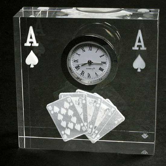 The crystal laser engraved decoration comes with an engaging poker card design. It is delicately finished with a stack of poker cards at the bottom. This piece also features a round-shaped clock with Roman time markers.