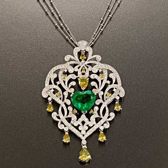 This gorgeous pendant features white crystals all over. The green heart-shaped crystal and yellow pear-shaped crystals showcase a touch of sophistication. This trendy pendant adds a fun splash of color to your wardrobe.