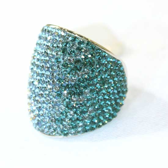 This featured ring is electroplated with 18K gold for added value and fanciness. The ring is fully paved with pale-blue Swarovski crystals for a touch of style. Bring a touch of romance to your outfit with this sparkling ring.