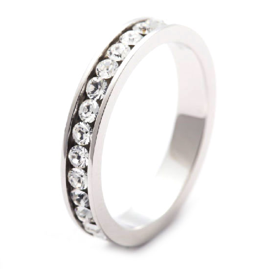 This crystal ring boasts a modest touch with its simple channel-cut design. The crystals sparkle with their near colorless glitter. The unpretentious style makes this ring a great everyday piece.