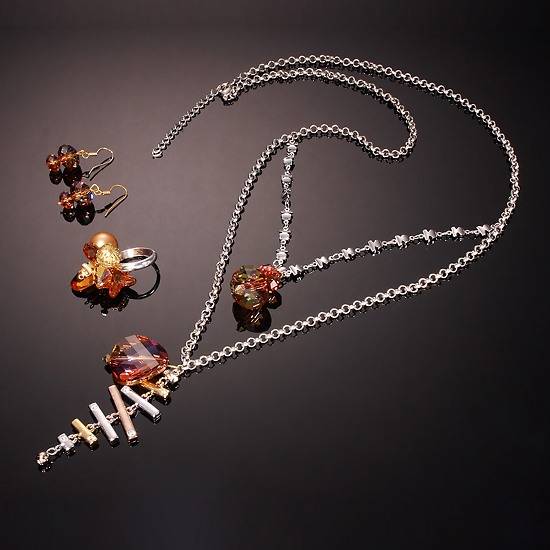 This jewelry set features a pair of earrings, a necklace and a ring, all embellished with Swarovski crystals. The double-strand necklace touts a lustrous metal loop chain with precious round-shape crystals in tortoise color. The dangling rectangular decorations in different lengths add a unique touch. Echoing with the matching ring and earrings, this jewelry set is your luxurious companion from casual to formal occasions.