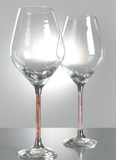 Delicate, elegant and very festive. Our “Sweet Eternity” wine and champagne collection is a set of two glasses for very special occasions. The clear crystals that fill the stems and the faceted pink or purple crystal base with 6 matching crystal stones on the metal components add an element of romance to any evening - making it a touch more special.