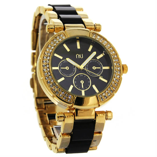 - Gold plated watch with round bezel inlayed with shimmering crystals.