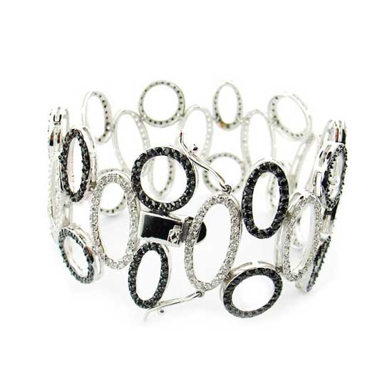 This is a series of stylish bracelets that comes with a simple yet elegant design. This bangle bracelet features dazzling black or white cubic zirconia stones on a lustrous metal setting. Each jewelry piece is accentuated by a highly polished finish and offers easy slip-on styling.