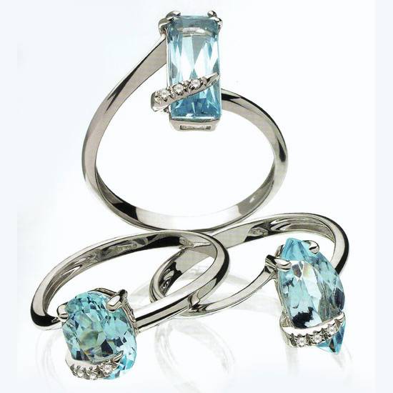 This is a series of cubic zirconia imitation rings. The rings features a large pale blue cubic zirconia stone in the middle. The stone is set by two prongs and a claw over the cubic zirconia stone.