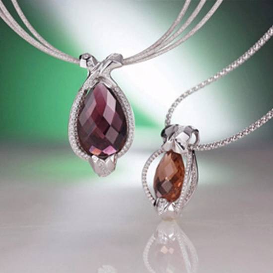 - One of the necklaces with triple chain and a pear shaped pendant.