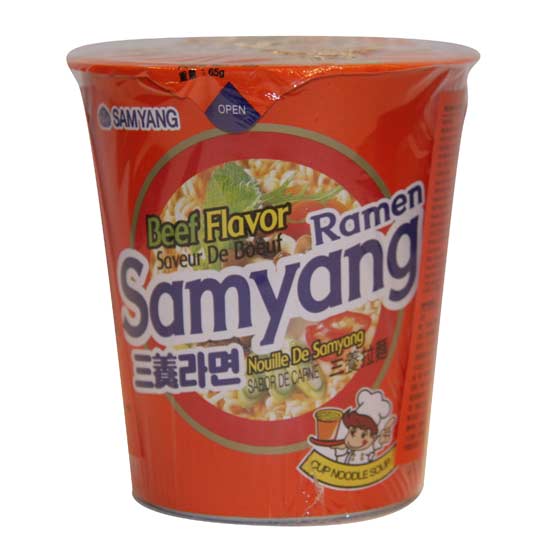 Displayed here is a cup of instant noodles with a beef flavor. The quality packaging promises a long shelf life. Prepare a quick meal with these savory cup noodles.