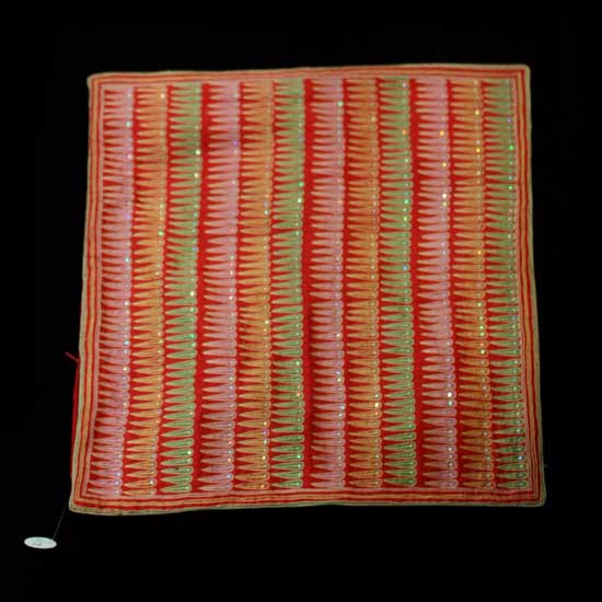 This square-shaped cushion cover features a fancy design in multiple colors. Rows of teardrop shapes adorned with shiny detail adorn this item. The passionate color and extravagant detail decorate your house with attractive, ethnic charm.