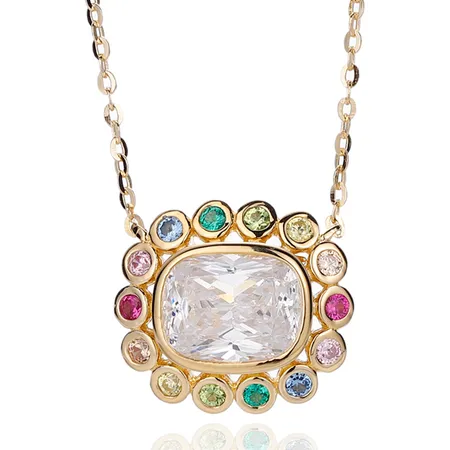Cushion White And Round Rainbow Cubic Zircon Silver Necklace With Glod Plating