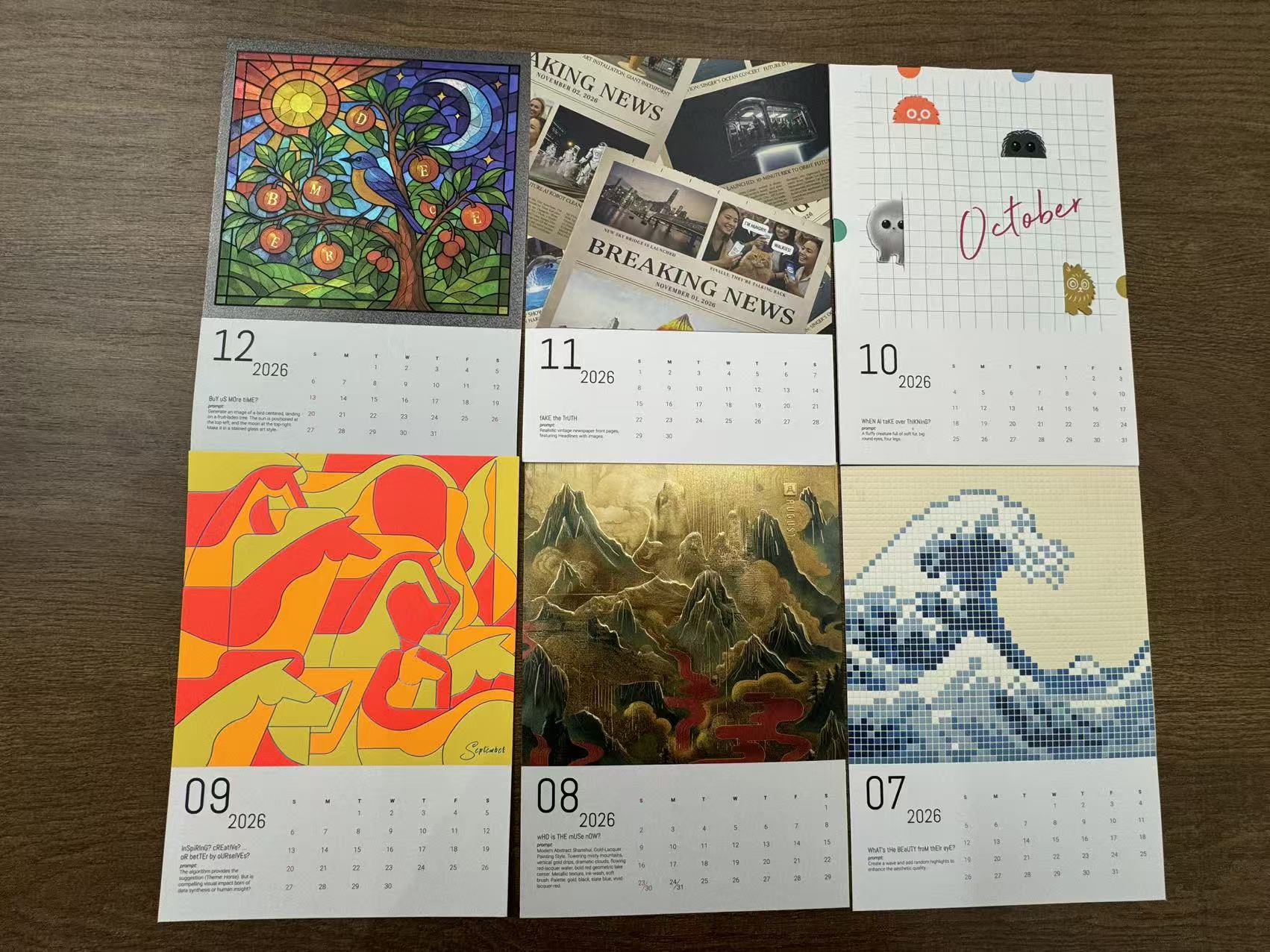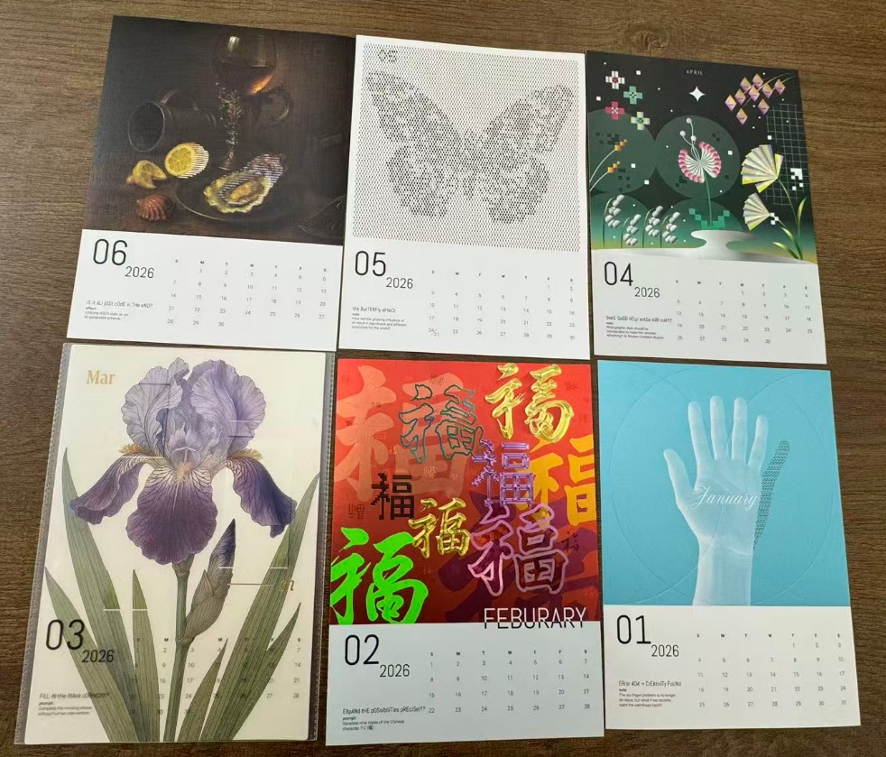This is a calendar set which contains 12 individual monthly sheets in a rigid gift box, showing a full range of premium post-printing production effects namely hot stamping, laser die cut, cold foiling and holographic effect etc.