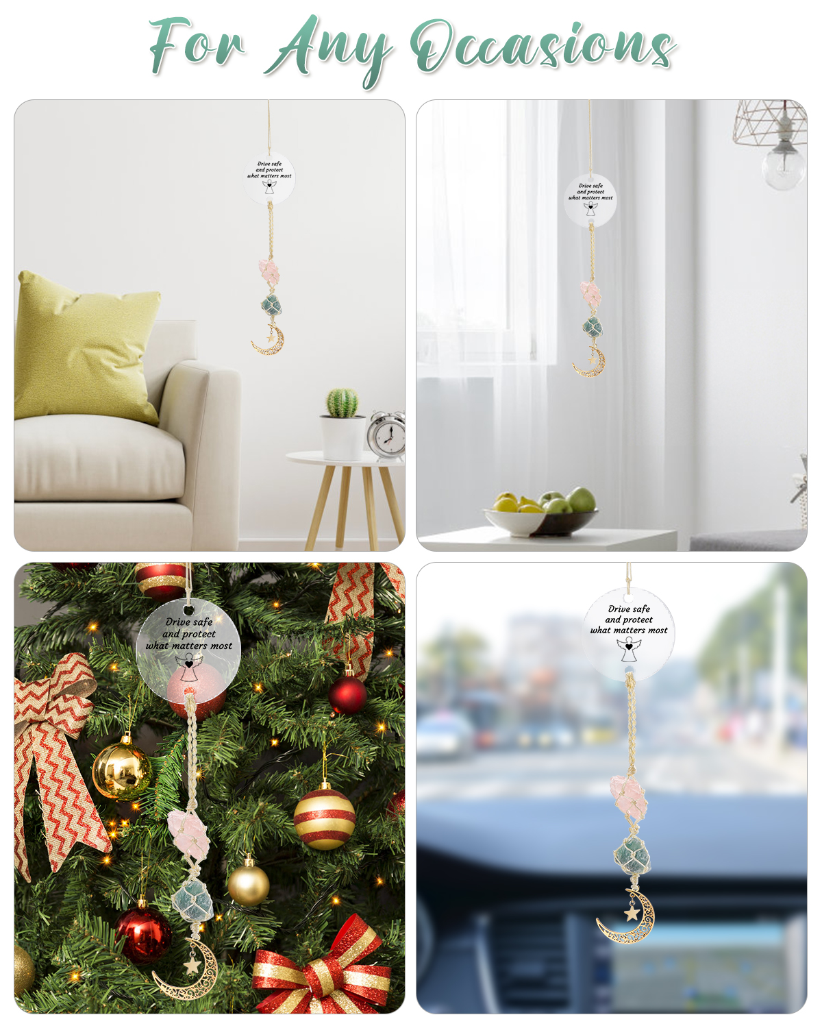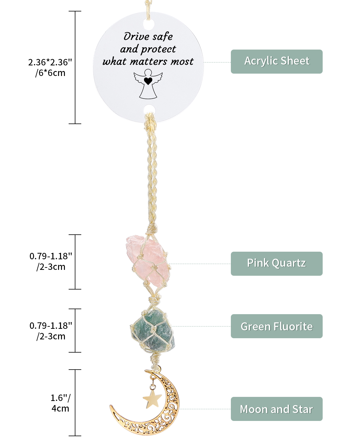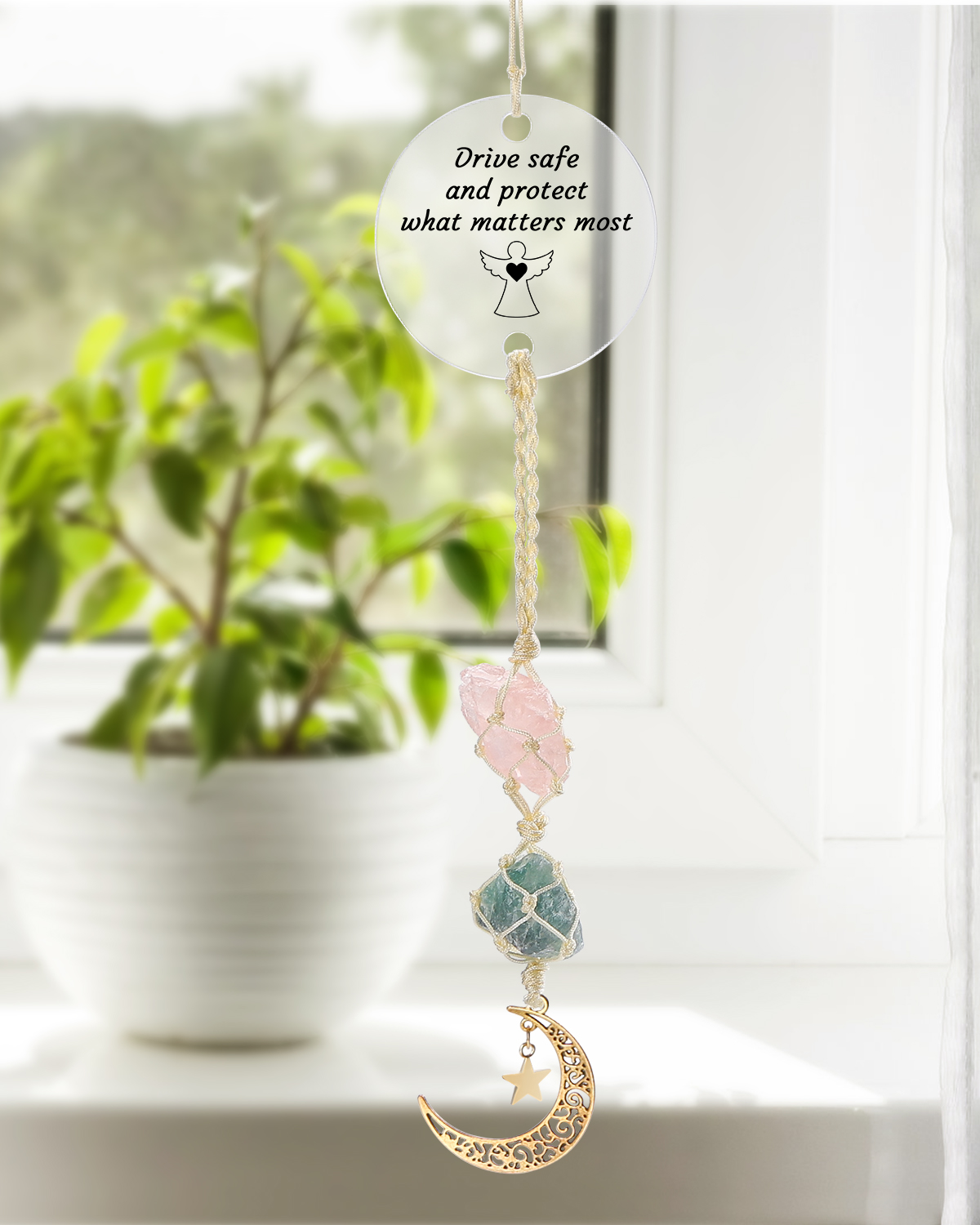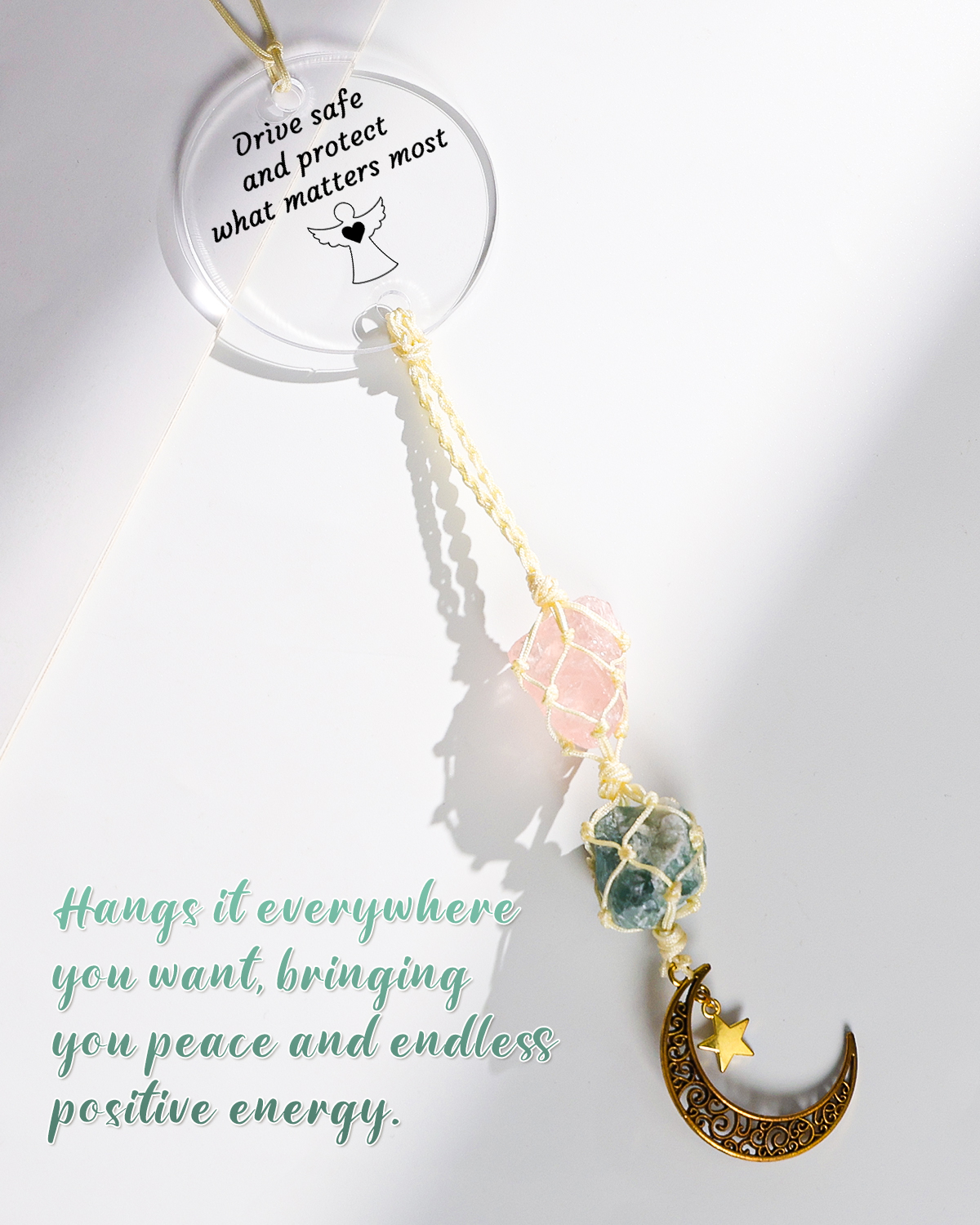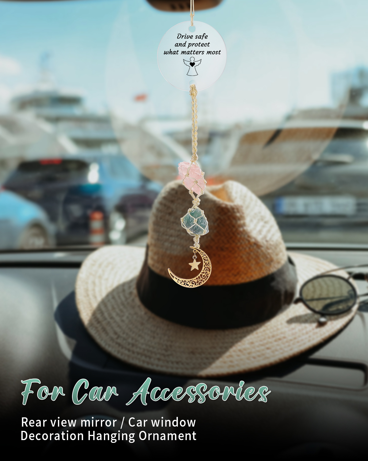 This Custom Drive Safe Car Hanging Ornament crafted from premium clear acrylic, paired with hand-woven natural crystal stones (Pink Quartz & Green Fluorite) and an exquisite moon & star metal charm, it combines emotional value, decorative function and positive energy. It is an ideal choice for bulk customization, wholesale and OEM/ODM for gift shops, cross-border e-commerce, auto accessory brands and corporate gifting.