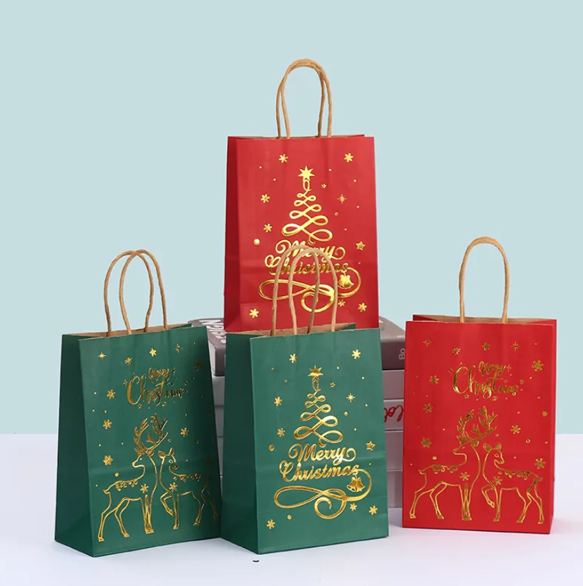 Custom Logo Christmas Kraft Paper Tote Bag for Clothing Socks Cross-Border Gilding Printing Hot Stamping for Milk Tea Holiday